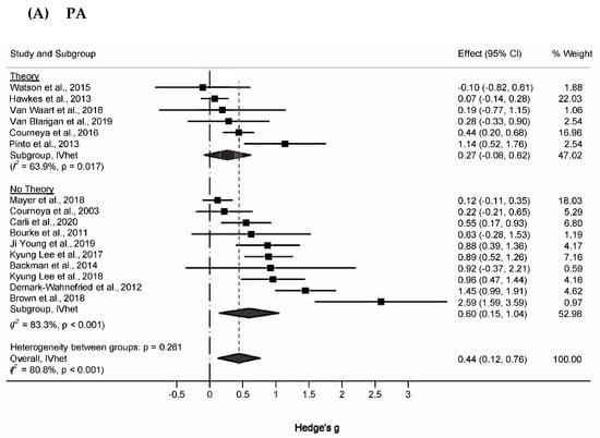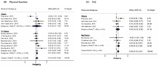 Subgroup analyses of changes in PA are shown in Figure 3A. For atheoretical and theoretical-based trials, effect sizes were 0.60 (95% CI, 0.15 to 1.04, Q = 53.9, p < 0.001, I2 = 83.3%, 95% CI, 70.7% to 90.5%), and 0.27 (95% CI, −0.08 to 0.62, Q = 13.8, p = 0.017, I2 = 63.9%, 95% CI, 12.7% to 85.1%), respectively. Z-tests indicated that changes in PA did not differ significantly between these subgroups (Zdiff = 1.43, p = 0.23). The magnitude of this difference (Diff = 0.33, 95% CI −0.12 to 0.78) supplemented these findings by suggesting that the true difference in changes in PA between atheoretical and theoretical works probably fell between −0.12 and 0.78, a range that includes the null value. (95% PI in Tables S8 and S9). This pattern was also similar to physical function, in which the difference in effect sizes between atheoretical (g = 0.21, 95% CI, 0.01 to 0.40, Q = 7.0, p = 0.32, I2 = 13.8, 95% CI, 0% to 74.8%) and theoretically based studies (g = 0.15, 95% CI, −0.77 to 1.07, Q = 15.6, p = 0.001, I2 = 15.5, 95% CI, 49.3% to 92.7%) was not statistically significant (Zdiff = 0.33, p = 0.23; Diff = 0.06, 95%CI −0.29 to 0.41) (Figure 3B). The difference in peak exercise VO2 for theoretical (g = 0.23, 95% CI, −0.12 to 0.59, Q = 4.23, p = 0.23, I2 = 29%, 95% CI, 0% to 77.5%) and atheoretical works (g = 0.36, 95% CI, 0.12 to 0.59, Q = 1.10, p = 0.58, I2 = 0%, 95% CI, 0% to 56.0%) was non-significant (Figure 3C).