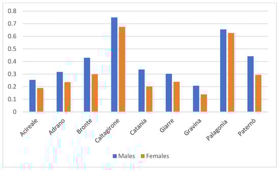 Males were consistently more represented than females in the disability population across all districts (overall: 56.7% males vs. 43.3% females), a pattern that contrasts with the general population of the province, where females are slightly more numerous (48.6% males vs. 51.4% females). When examining district-level patterns, the relative proportion of males with severe disability exceeded that of females in every district, ranging from 52–61% males and 39–48% females (Acireale 56/44%, Adrano 56/44%, Bronte 57/43%, Caltagirone 52/48%, Catania 61/39%, Giarre 55/45%, Gravina 58/42%, Palagonia 51/49%, Paternò 59/41%). Notably, this male predominance persists even in districts where the general population shows a more balanced sex distribution or a slight female majority. The comparison between absolute population data and disability-specific proportions therefore confirms that the male excess is not a reflection of district demographic structure but represents a true epidemiological over-representation of males within the severe-disability cohort (Figure 2).