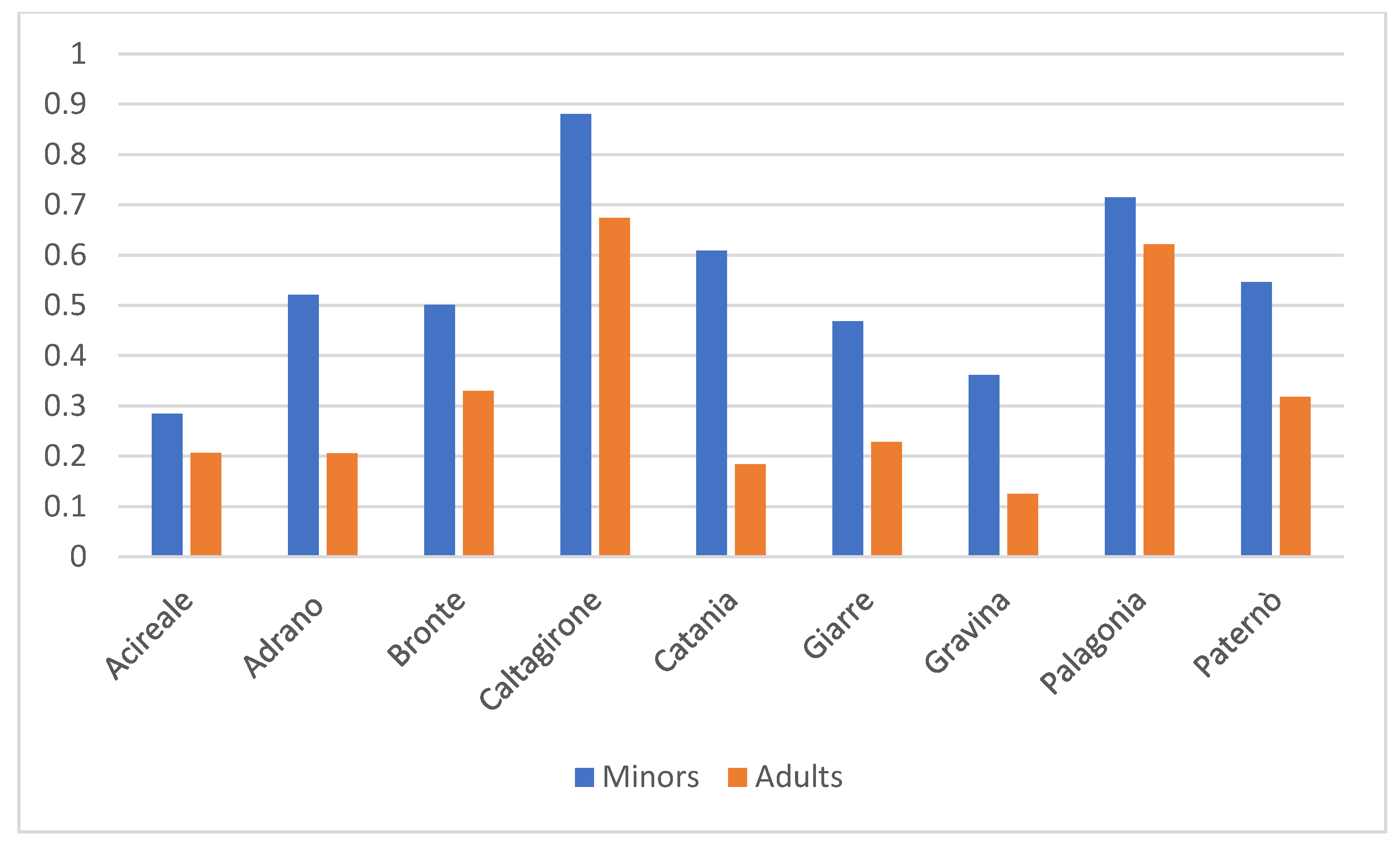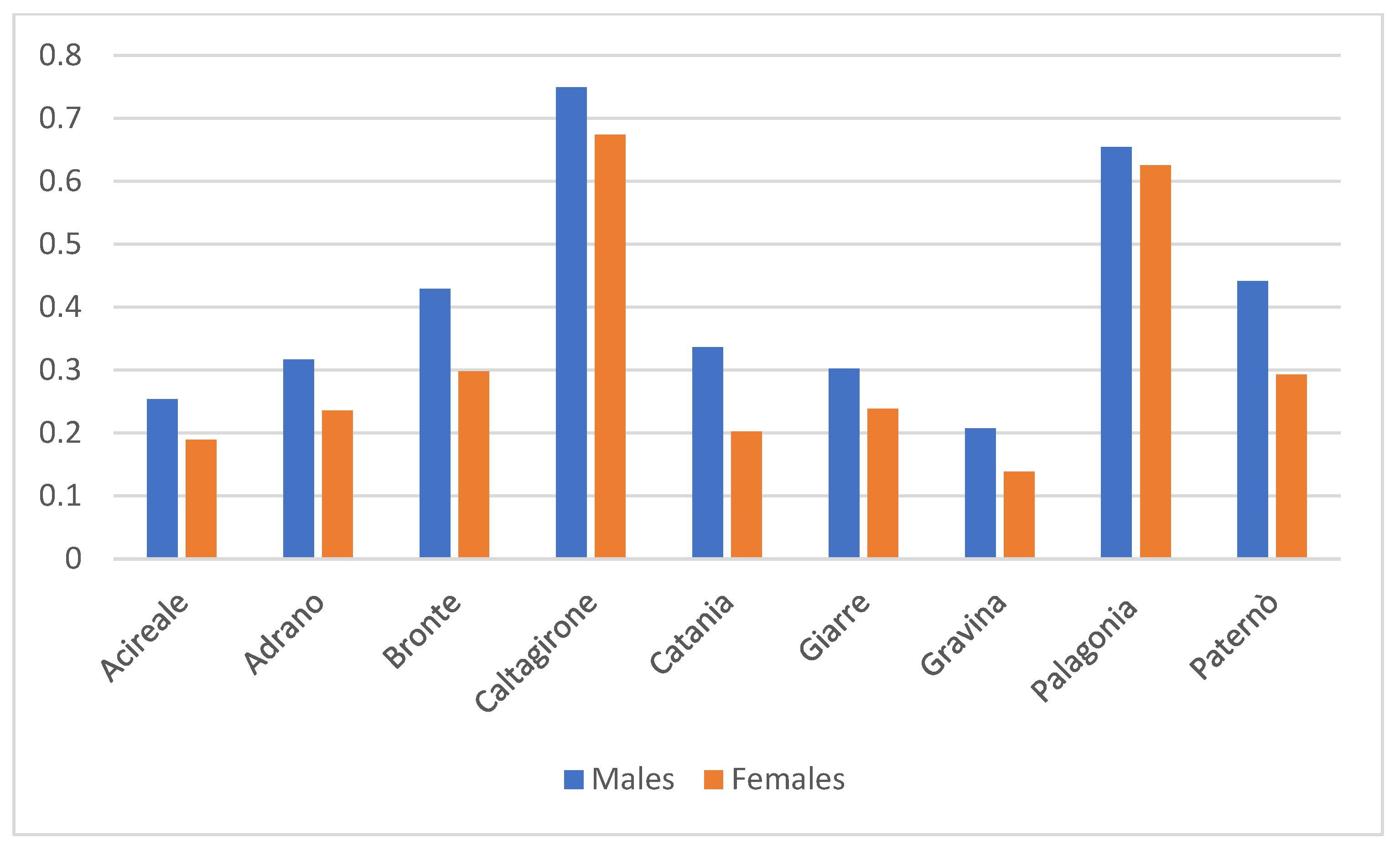 | Femaleswith Disability/Total Female Population | 43%/51% | Acireale | 299 |