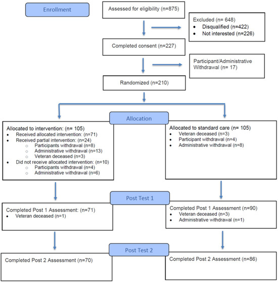 Attrition between randomization and the first post-intervention assessment was higher in the intervention group compared to standard care. Most withdrawals in the intervention arm were due to being “too busy,” followed by perceived lack of benefit from participating. Administrative reasons, such as inability to contact, eligibility changes, and veteran death—also contributed substantially. Standard care withdrawals were fewer and primarily related to contact issues and time constraints.