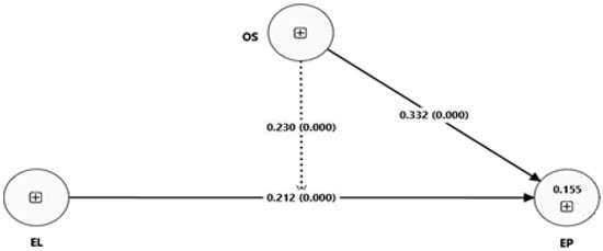 As shown in Figure 4, EL has a positive impact on EP. Moreover, OS has a positive effect on EP. Furthermore, OS strengthens the positive impact of EL on EP.