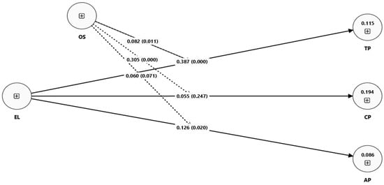 Similarly, F2 describes the magnitude of the effect of one exogenous variable on another. The effect size can be classified as follows: F2 < 0.02 reflects no effect, F2 from 0.02 to 0.149 signifies a small effect, F2 ranging from 0.15 to 0.349 signifies a medium effect, and F2 ≥ 0.35 signifies a large effect [63]. The estimated F2 values for the overall EP as an endogenous variable were 0.387 for EL, 0.368 for OS, and 0.367 for the moderation of OS, all with large effect sizes. For TP, the F2 values were 0.120 for EL, 0.258 for OS, and 0.134 for the moderation of OS, reflecting medium effect sizes. For CP, the F2 values were 0.127 for EL, 0.166 for OS, and 0.125 for the moderation of OS, suggesting that all these effects fell into small-to-medium effect sizes. Finally, for AP, the F2 values were 0.119 for EL, 0.233 for OS, and 0.134 for the moderation of OS, indicating small-to-medium effect sizes. This pattern shows that the model explains only a modest proportion of variance, as reflected in the low R2 value. Nevertheless, the substantive effect sizes of EL and OS remain meaningful, reinforcing their theoretical and practical importance.