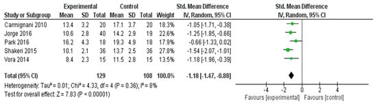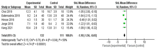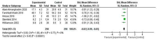 A meta-analysis was conducted to evaluate the effectiveness of interventions in alleviating menopausal symptoms across five RCTs [26,31,32,37,56] (Figure 3). The pooled SMD, calculated using a random effects model, was −1.18 (95% CI: −1.47 to −0.88), indicating a statistically significant large effect favoring the experimental group (Z = 7.83, p < 0.00001).