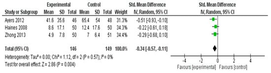 No heterogeneity was observed among the included studies (I2 = 0%, τ2 = 0.00, χ2 = 1.12, df = 2, p = 0.57), suggesting consistency in intervention effects across trials. These results demonstrated that the interventions were modestly effective in alleviating hot flash symptoms in postmenopausal women.