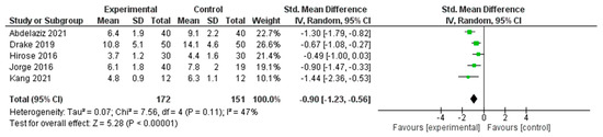 A meta-analysis was conducted to determine the effects of interventions on sleep quality across five RCTs [29,37,39,41,52] (Figure 7). The pooled SMD, calculated using a random effects model, was −0.90 (95% CI: −1.23 to −0.56), indicating a statistically significant large effect in favor of the experimental group (Z = 5.28, p < 0.00001).