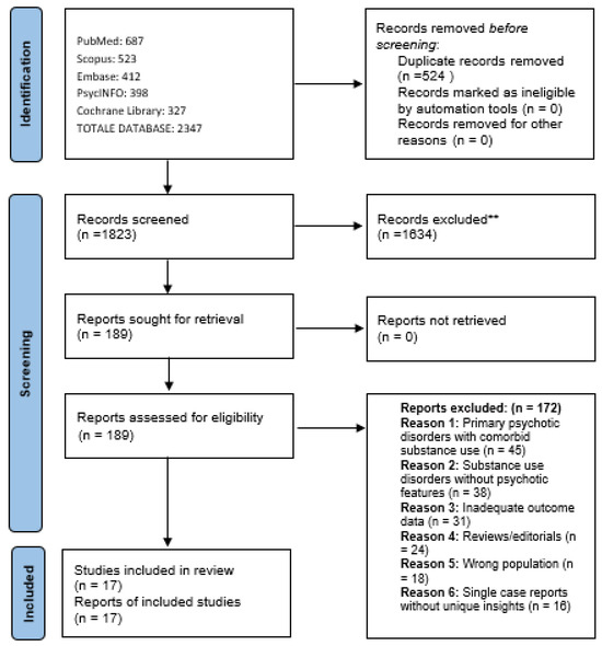 The scoping review search and selection process is illustrated in Figure 1. The comprehensive search strategy yielded 2347 potentially relevant citations across all databases. After removal of duplicates (n = 524), 1823 unique citations underwent title and abstract screening. Following initial screening, 189 full-text articles were retrieved and assessed for eligibility against the pre-specified inclusion criteria. Of these, 172 were excluded for the following reasons: studies of primary psychotic disorders with comorbid substance use rather than substance-induced psychosis (n = 45), substance use disorders without psychotic features (n = 38), inadequate outcome data (n = 31), reviews or editorials (n = 24), wrong population (n = 18), single case reports without unique insights (n = 16) (Figure 1).