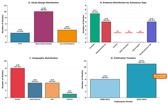 Seventeen studies ultimately met eligibility criteria and were included in this scoping review. The characteristics of included studies are summarized in Table 2, with study distribution by design, substance type, geography, and publication timeline illustrated in Figure 2.