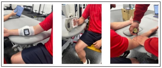 Exercises were performed using a wrist roller bar (2.5 kg load), elastic resistance bands, and handgrip squeezes at a cadence of approximately one repetition per second. Minimal rest intervals (<30 s) were allowed between sets to maintain metabolic stress and ensure continuous loading of the forearm musculature. The between-arm transition periods did not exceed 2 min.
