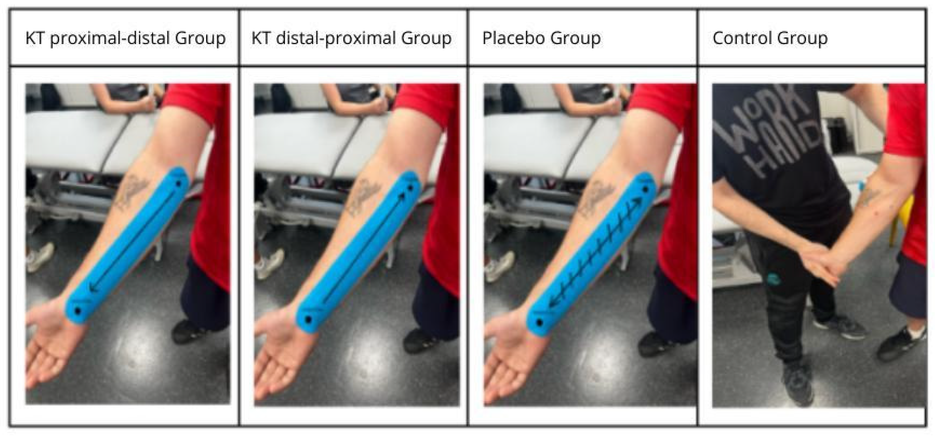 Participants were randomly assigned to one of four intervention groups: Group 1 received KT applied to the forearm with proximal-to-distal tension pattern. Group 2 received KT with a distal-to-proximal tension. Group 3 served as the placebo group, in which KT was applied without tension. Group 4 served as the control group and did not receive any KT application (Figure 1).