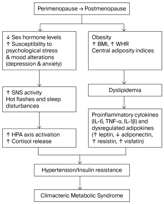 Conceptual flow diagram summarizing the interrelationships among neuroendocrine, psychological, and metabolic factors associated with metabolic syndrome during the climacteric transition. The abrupt decline in sex hormone levels increases vulnerability to psychological stress, anxiety, and depressive symptoms. This heightened stress reactivity involves overactivation of the sympathetic nervous system (SNS) and hypothalamic–pituitary–adrenal (HPA) axis, leading to elevated cortisol levels, central obesity, and systemic arterial hypertension. The menopausal transition is also accompanied by increased abdominal adiposity, dyslipidemia, and a proinflammatory state characterized by altered cytokines and adipokines, which together contribute to metabolic dysregulation in midlife women.