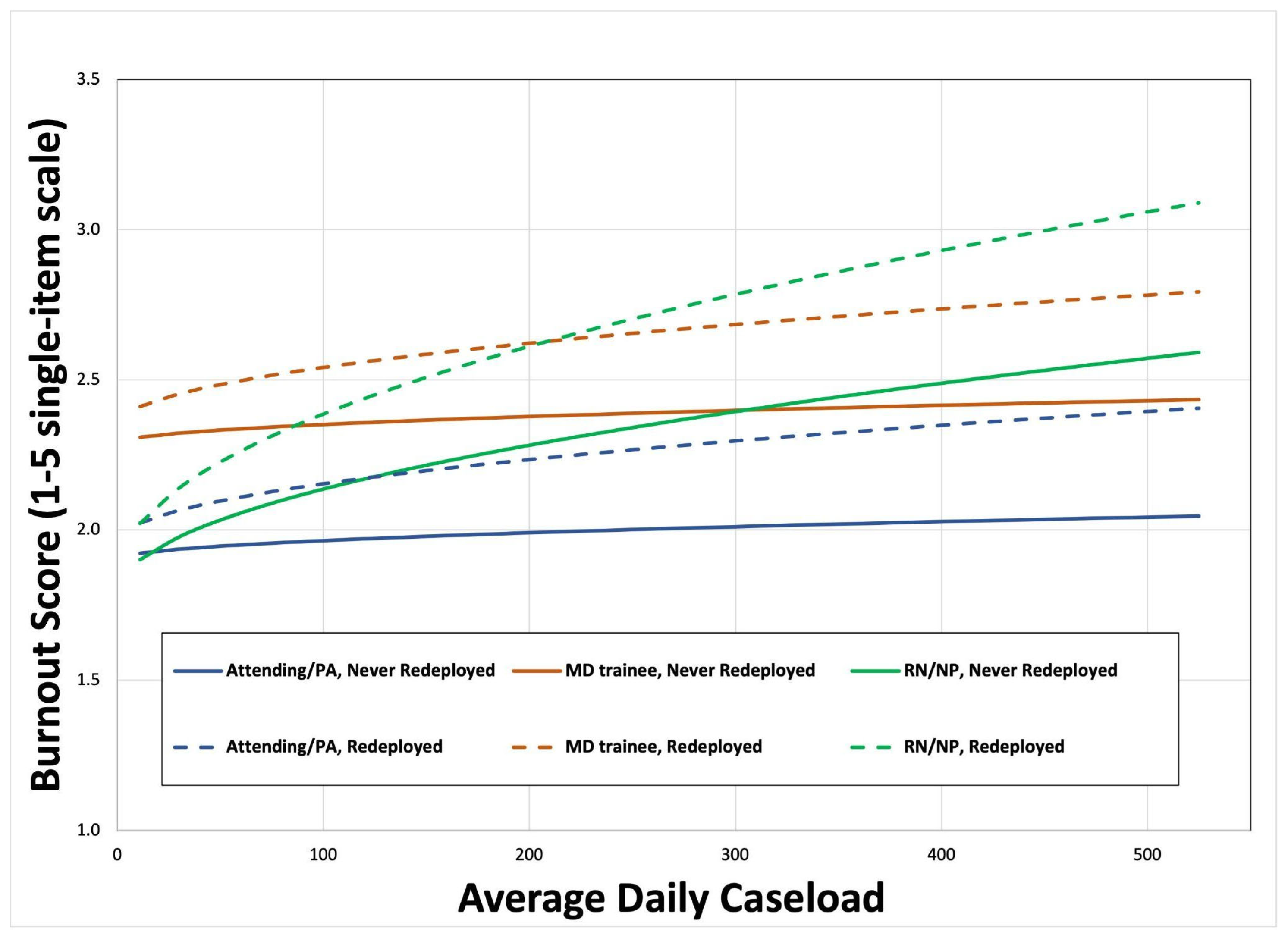 - Redeployment and higher caseloads increased burnout, with effects persisting after return to usual roles.