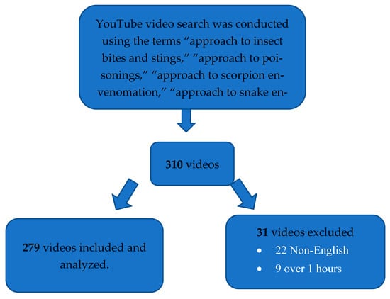 The official YouTube website (https://www.youtube.com) was used as the data source. Searches were performed on 1 August 2025 using the terms “approach to insect bites and stings,” “approach to poisonings,” “approach to scorpion envenomation,” “approach to snake envenomation,” and “approach to mushroom poisoning.” The selection of these keywords was guided by two factors: first, they reflect standard terminology commonly used in emergency medicine and toxicology guidelines, and second, a preliminary keyword exploration using YouTube’s autocomplete function indicated that these phrases are frequently searched by general viewers seeking poisoning-related information. To minimize algorithmic bias, all searches were conducted in incognito mode without signing into a Google account, and videos were sorted using YouTube’s default relevance algorithm, which incorporates factors such as views, likes, recency, and user engagement. Only English-language videos shorter than one hour were included in the analysis, while non-English and longer videos were excluded.