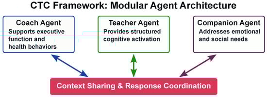 Figure 2 shows modular agent architecture of the CTC Framework. The Coach Agent reinforces executive function through behavioral interventions integrated into daily activities. Digital coaching interventions have demonstrated effects on physical activity and medication adherence in older populations [48,49]. The agent employs implementation intention strategies and contextual reminders to support adherence [50].