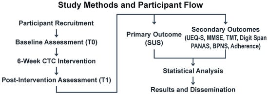Study Protocol Flowchart. The CTC Framework feasibility evaluation includes participant screening and enrollment (n ), baseline assessment (T0) with cognitive and digital literacy measures, six-week intervention (5 sessions/week, 30 min/session), post-intervention assessment (T1), and data analysis. Primary outcome: System Usability Scale (SUS). Secondary outcomes: user experience, cognitive function, emotional state, needs satisfaction, and adherence metrics. Approximately 10% attrition anticipated.