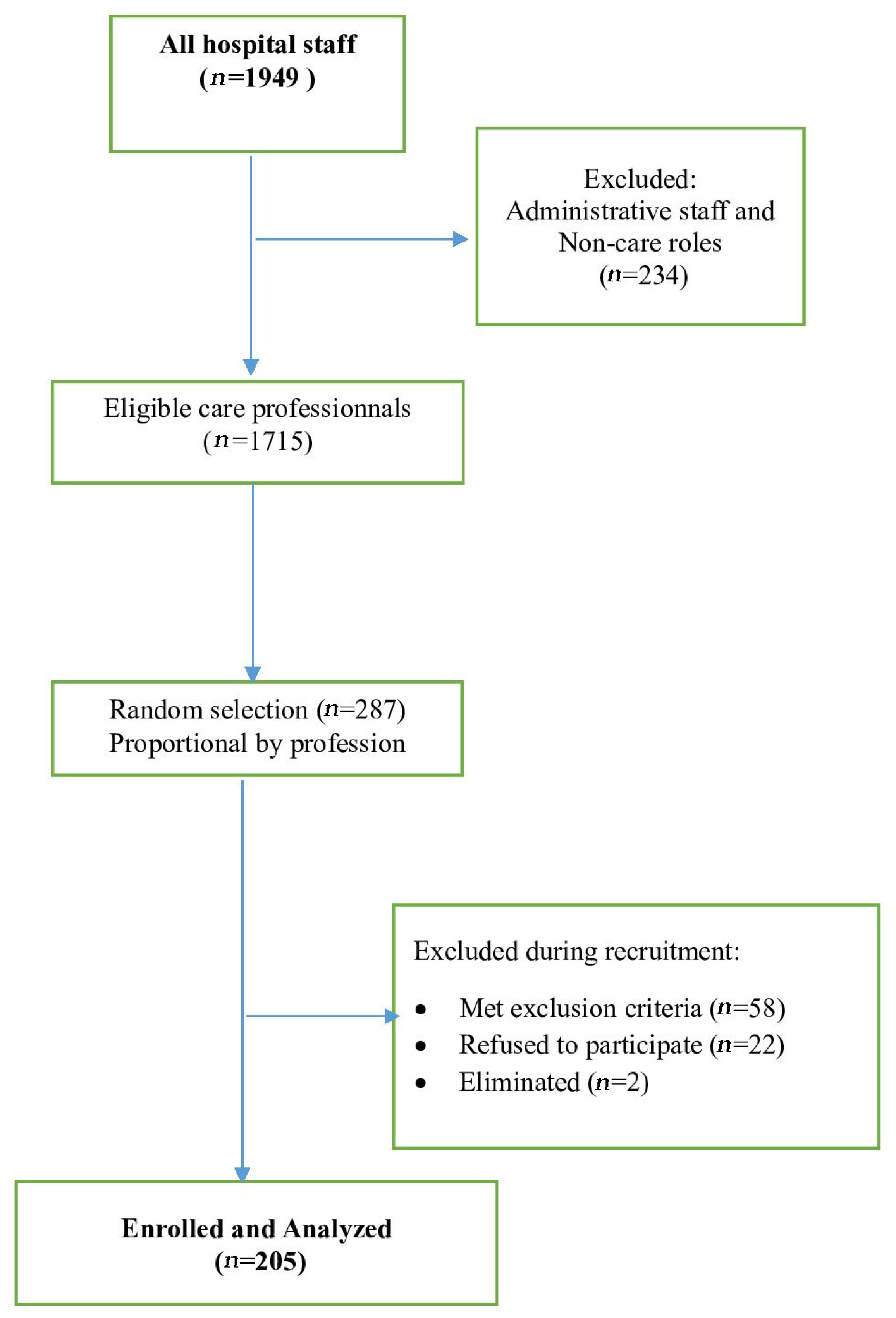 21]. The required sample size was 192 participants; ultimately, 205 healthcare professionals were enrolled. Participants were randomly selected from all healthcare departments.