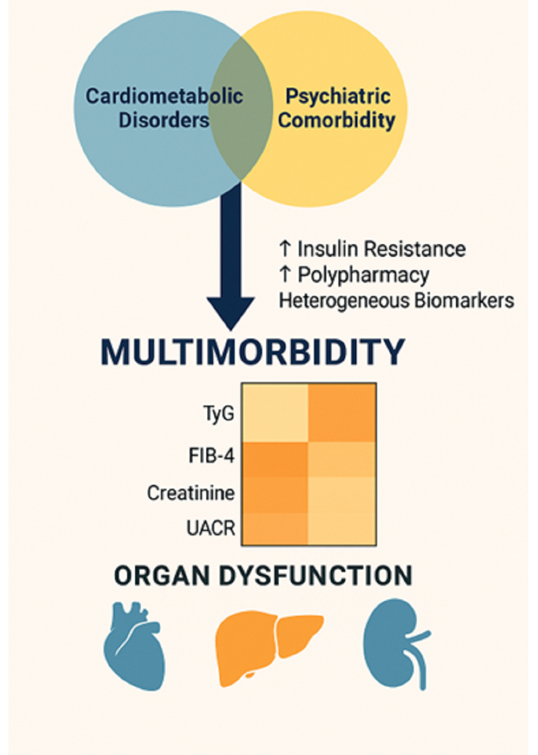 Biomarkers such as the triglyceride–glucose (TyG) index, FIB-4 score, serum creatinine, and urinary albumin–creatinine ratio (UACR) are widely used to capture metabolic, hepatic, and renal involvement in cardiometabolic disease. The TyG index is a validated surrogate marker of insulin resistance and has been linked to both cardiovascular morbidity and depressive/anxiety symptomatology. Similarly, the FIB-4 score is used to estimate liver fibrosis in NAFLD, closely associated with metabolic syndrome. Renal biomarkers, including creatinine and UACR, provide insight into glomerular filtration and microvascular damage, pathways which are also implicated in neuropsychiatric vulnerability. However, the extent to which these markers align—or diverge—within patients exhibiting psychiatric comorbidity remains poorly characterized [