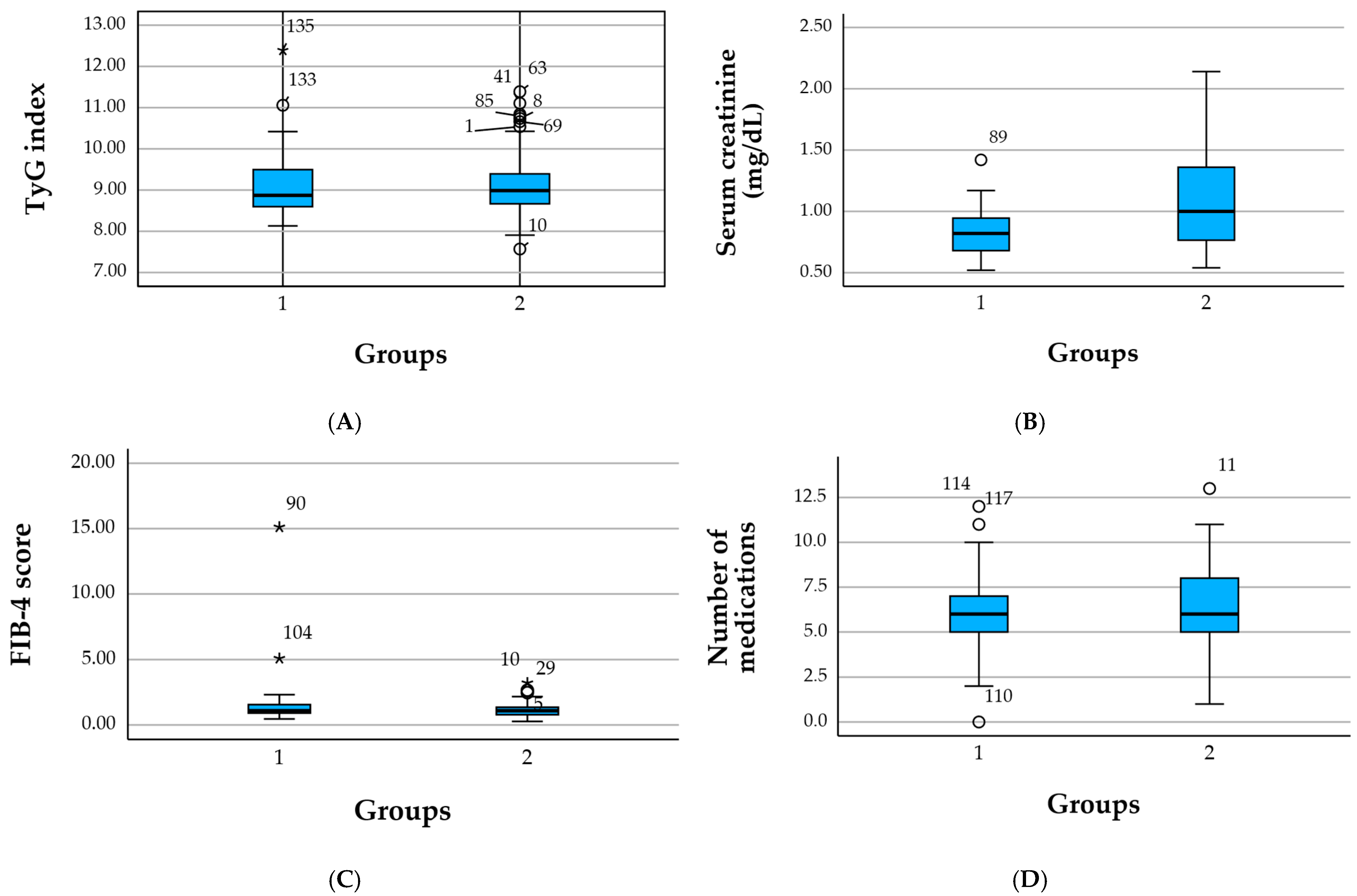 A total of 148 patients were included in the cohort analysis, classified into two subgroups according to the presence of cardiometabolic disease: 47 patients with cardiometabolic morbidity (group 1) and 96 patients with other comorbidities (group 2). The remaining 5 subjects had missing classification and were excluded from comparative subgroup analyses. To assess outlier impact, we repeated analyses using median values and 10% winsorized means. Trends remained directionally similar, though effect sizes attenuated, confirming high inter-individual variability. Winsorized re-analysis attenuated mean values of FIB-4 and creatinine but did not substantially alter relative between-group trends, suggesting that outliers magnify variance rather than fully drive observed patterns. Interpretations were revised to reflect this uncertainty.