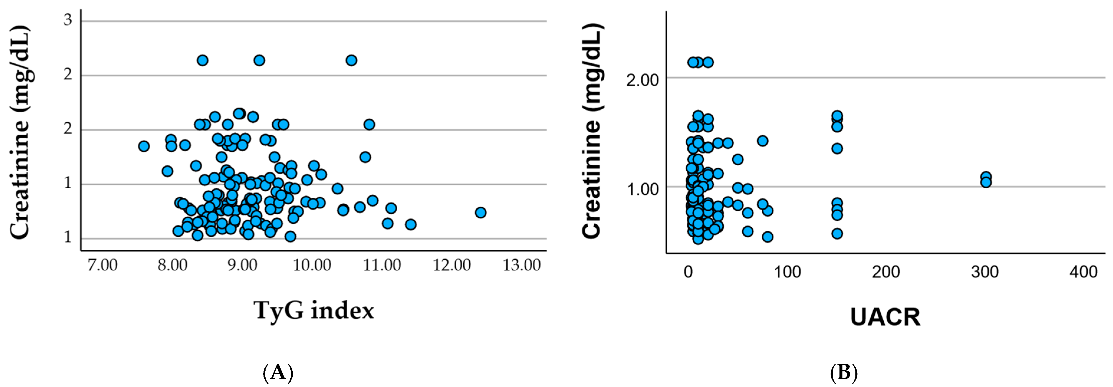 Figure 2A show the serum creatinine plotted against the TyG index shows substantial dispersion with no clear linear trend, indicating that insulin resistance (as reflected by the TyG index) does not directly align with the degree of renal impairment in this cohort, and