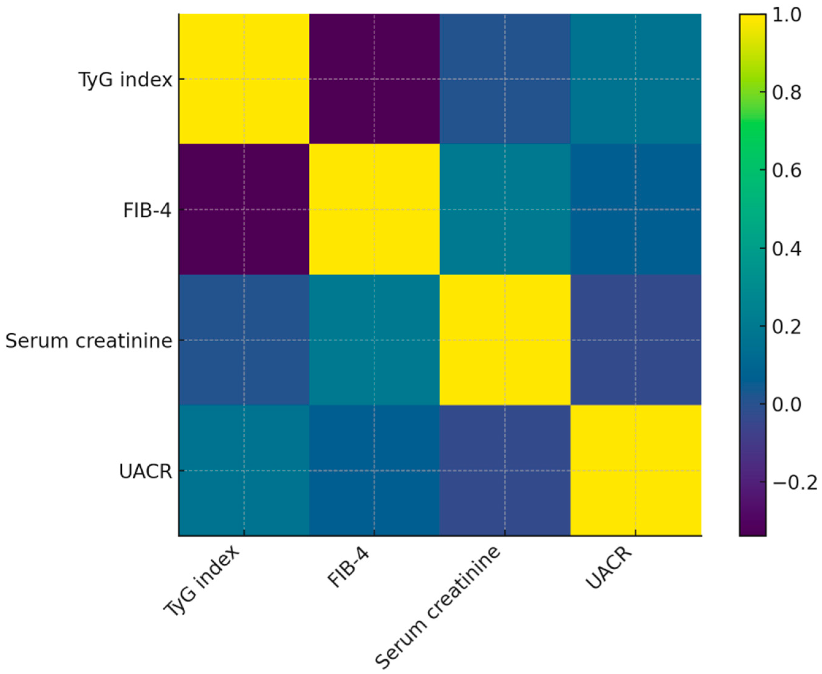 Interrelationships among metabolic, hepatic, and renal biomarkers (TyG index, FIB-4, creatinine, UACR, and Scor total where available) were evaluated using Spearman rank correlation coefficients. Results were visualized using a correlation heatmap generated with matplotlib.