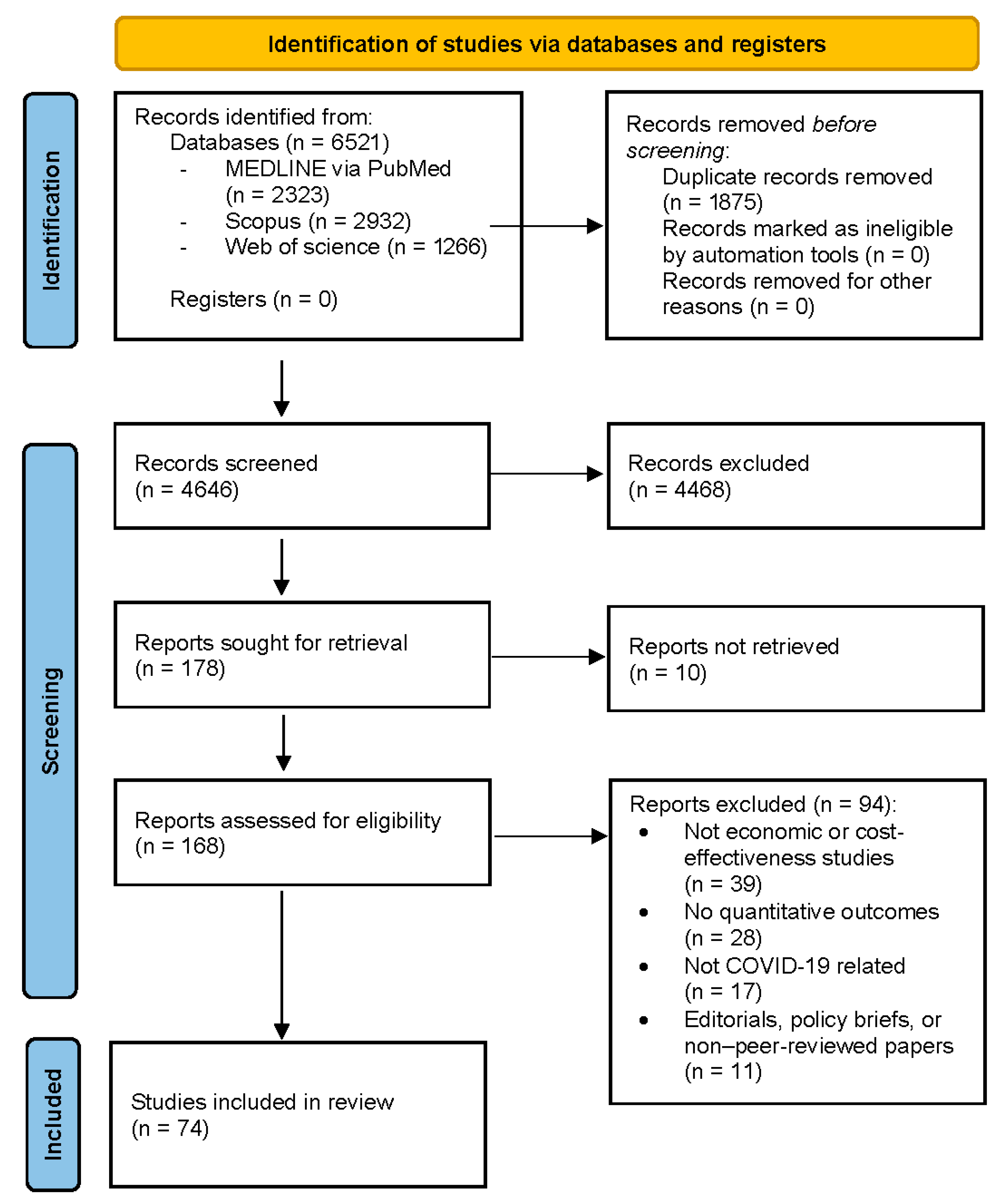 | PubMed (MEDLINE) | ((COVID-19 OR SARS-CoV-2 OR coronavirus) AND (“cost-effectiveness” OR “economic evaluation” OR “budget impact”) AND (vaccination OR testing OR “non-pharmaceutical interventions” OR “social distancing”)) | English language; humans; journal articles; 2020–2025 | 2323 |