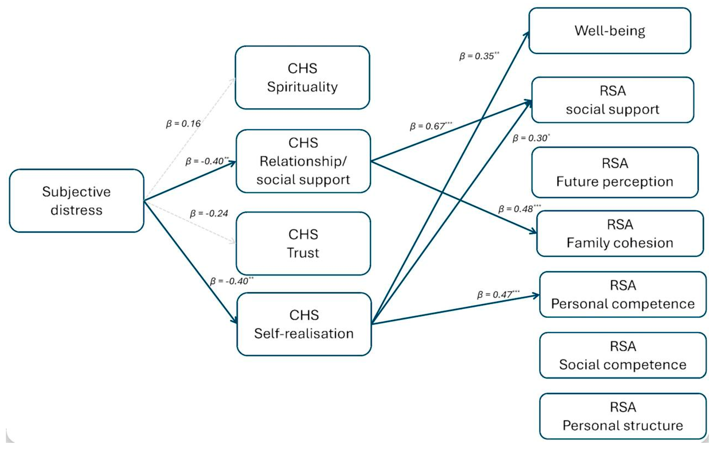 | Subjective distress–relationship/social support–family cohesion | 0.19 | 0.28; 3.09 | 0.017 |