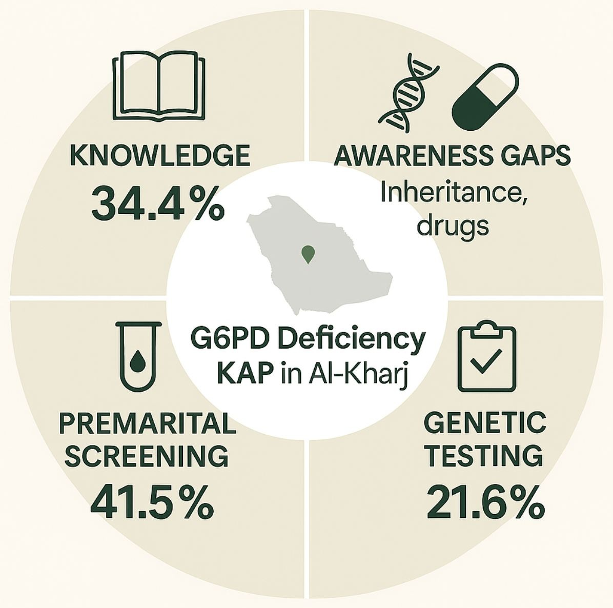 - Knowledge of G6PD deficiency in Al-Kharj was limited, with major gaps in inheritance, medication triggers, and non-fava dietary risks.