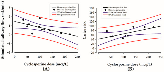 Correlations between cyclosporine dose in mcg/L (X-axis) and stimulated salivary flow in mL/min (Y-axis) (A), and between cyclosporine dose in mcg/L (X-axis) and caries risk according to Cariogram in 0–100% (Y-axis) (B).