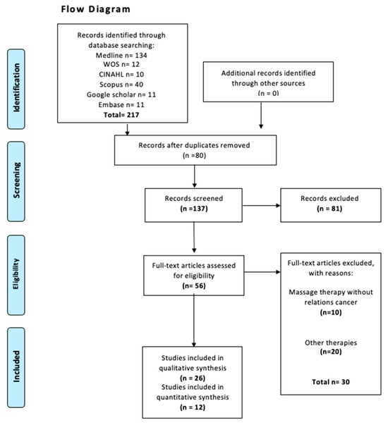 Exclusion Criteria Studies were excluded if they were case reports, case series, editorials, letters, reviews, or non-human studies; lacked a control or comparison group; evaluated complementary therapies other than massage (e.g., acupuncture, reflexology, aromatherapy without massage); or included participants without cancer. Two reviewers independently screened titles and abstracts, followed by full-text assessment of potentially eligible studies. Disagreements were resolved through discussion or consultation with a third reviewer.