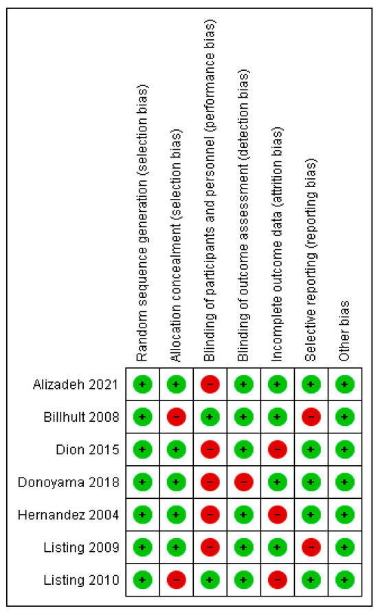Risk of bias assessment in individual studies included in the review. Green (+) indicates low risk of bias; red (−) indicates high risk of bias [6,7,18,23,24,25,27].