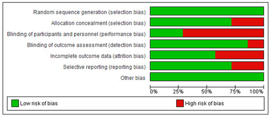 The RoB2 assessment is presented in Figure 2 and Figure 3. For random sequence generation, 100% of the studies were classified as having a “low risk” [5,6,7,18,23,24,25]. In allocation concealment, 71% were classified as having a “low risk” of bias [5,7,18,24,25], whereas 29% presented a “high risk” or “unclear risk” [6,23]. For blinding of participants and personnel, 28.6% of the trials received a “low risk” of bias rating [6,23], while 71.4% were judged as having a “high risk” [5,7,18,24,25]. For the blinding of outcome assessment, 71% of the trials were scored as “low risk” [5,6,7,18,23,24], and 29% as “high risk” [25]. For incomplete outcome data, 71% received a “low risk” rating [5,6,7,24,25], while 29% showed a “high risk” [18,19]. Finally, for the selection of reported results, 57% of the trials were scored as “low risk” [5,7,18,23,25], and 43% were scored as having a “high” risk of bias [6,24].