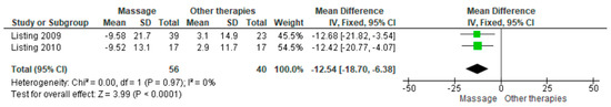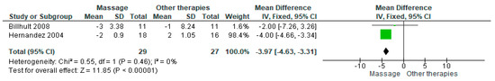 Forest plot showing the pooled mean difference in symptom intensity measured with the Visual Analog Scale (VAS) comparing massage therapy and placebo [18,27].