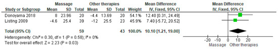 Two studies compared massage therapy with placebo using the EORTC Quality of Life Questionnaire (QLQ). The pooled standardized mean difference demonstrated a statistically significant improvement favoring massage (SMD = 10.10; 95% CI: 1.21 to 19.00; p = 0.03) (Figure 5) [24,25]. Confidence intervals showed consistent direction of effect, and heterogeneity was low (I2 = 0%, p = 0.58). The certainty of evidence was rated as very low (Supplementary Table S4).