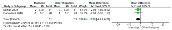 Two studies assessed anxiety and depression using the Hospital Anxiety and Depression Scale (HADS). The pooled analysis showed no statistically significant difference between massage and placebo (MD = −2.00; 95% CI: −4.21 to 0.21; p = 0.08) (Figure 6) [6,25]. Confidence intervals overlapped, and heterogeneity was absent (I2 = 0%, p = 1.00). The overall certainty of the evidence was rated as very low (Supplementary Table S4).