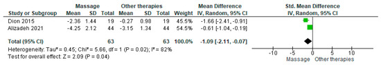 Two studies compared massage with placebo using the Visual Analog Scale (VAS) for symptom intensity. The pooled estimate showed a small but statistically significant benefit (MD = −1.09; 95% CI: −2.11 to −0.07; p = 0.04) (Figure 8) [5,18]. Substantial heterogeneity was detected (I2 = 82%, p = 0.02). The overall certainty of the evidence was judged as very low (Supplementary Table S4).