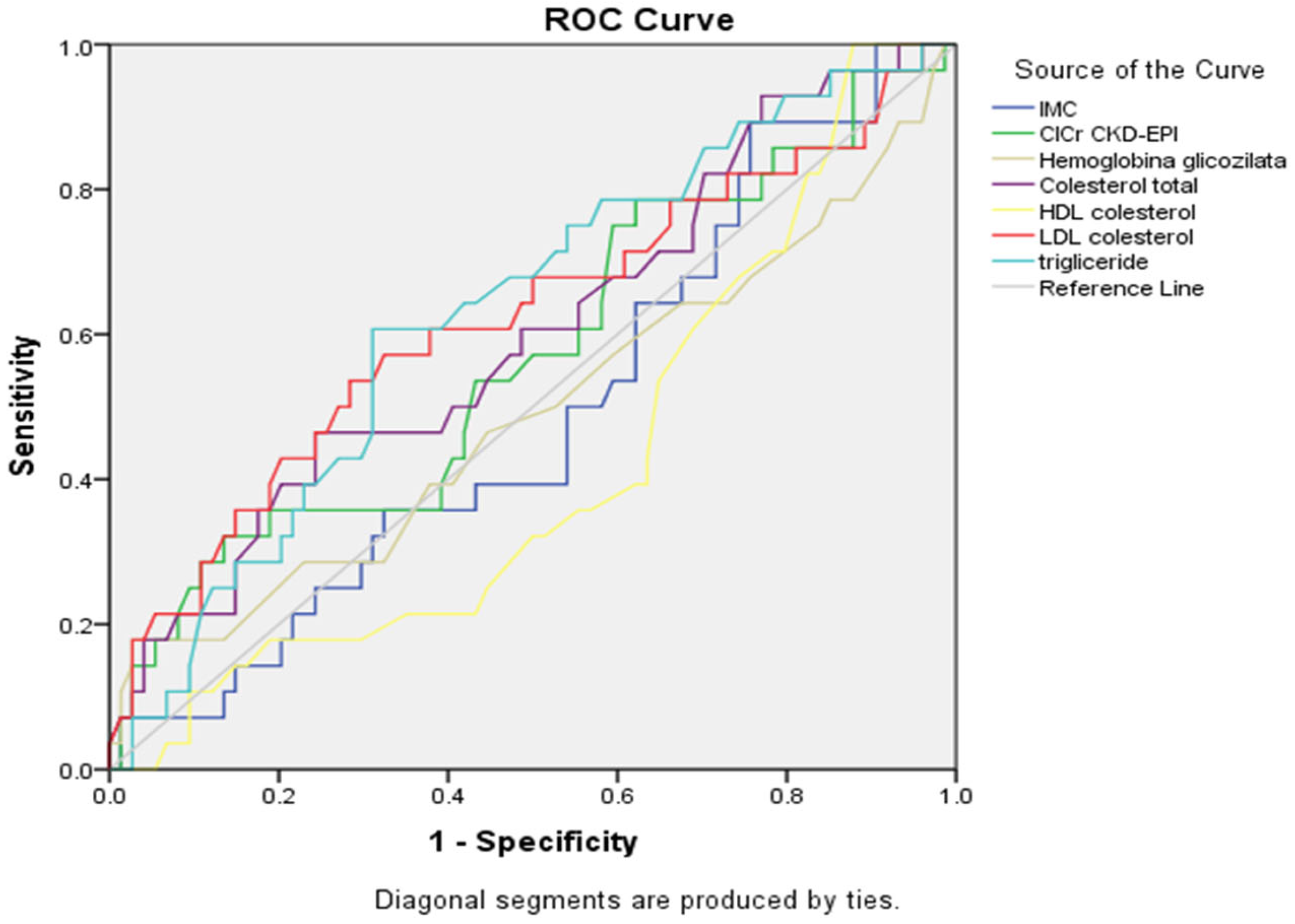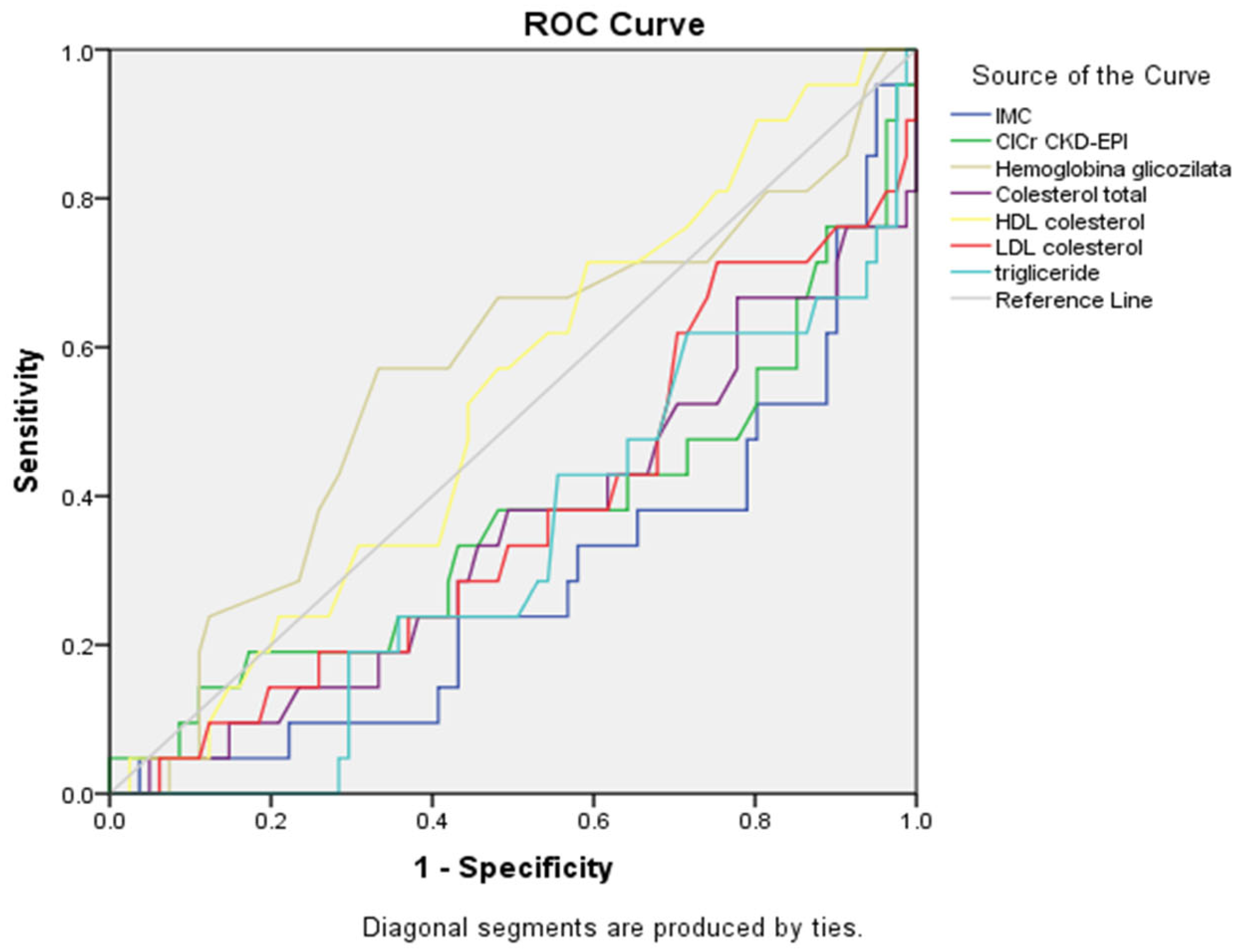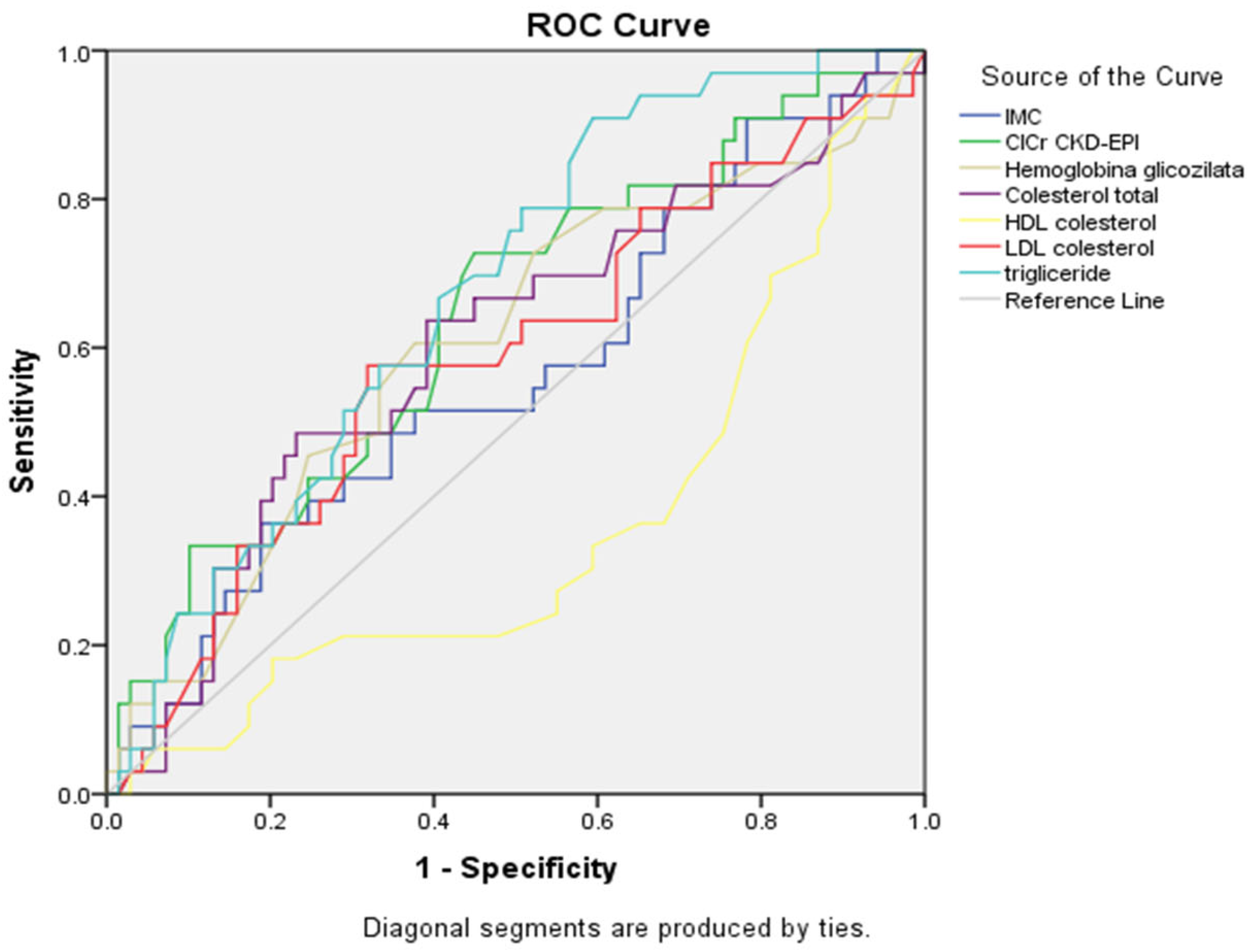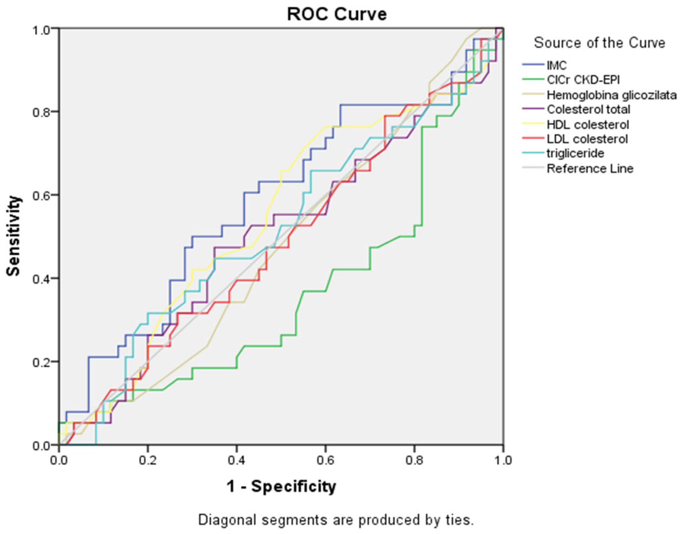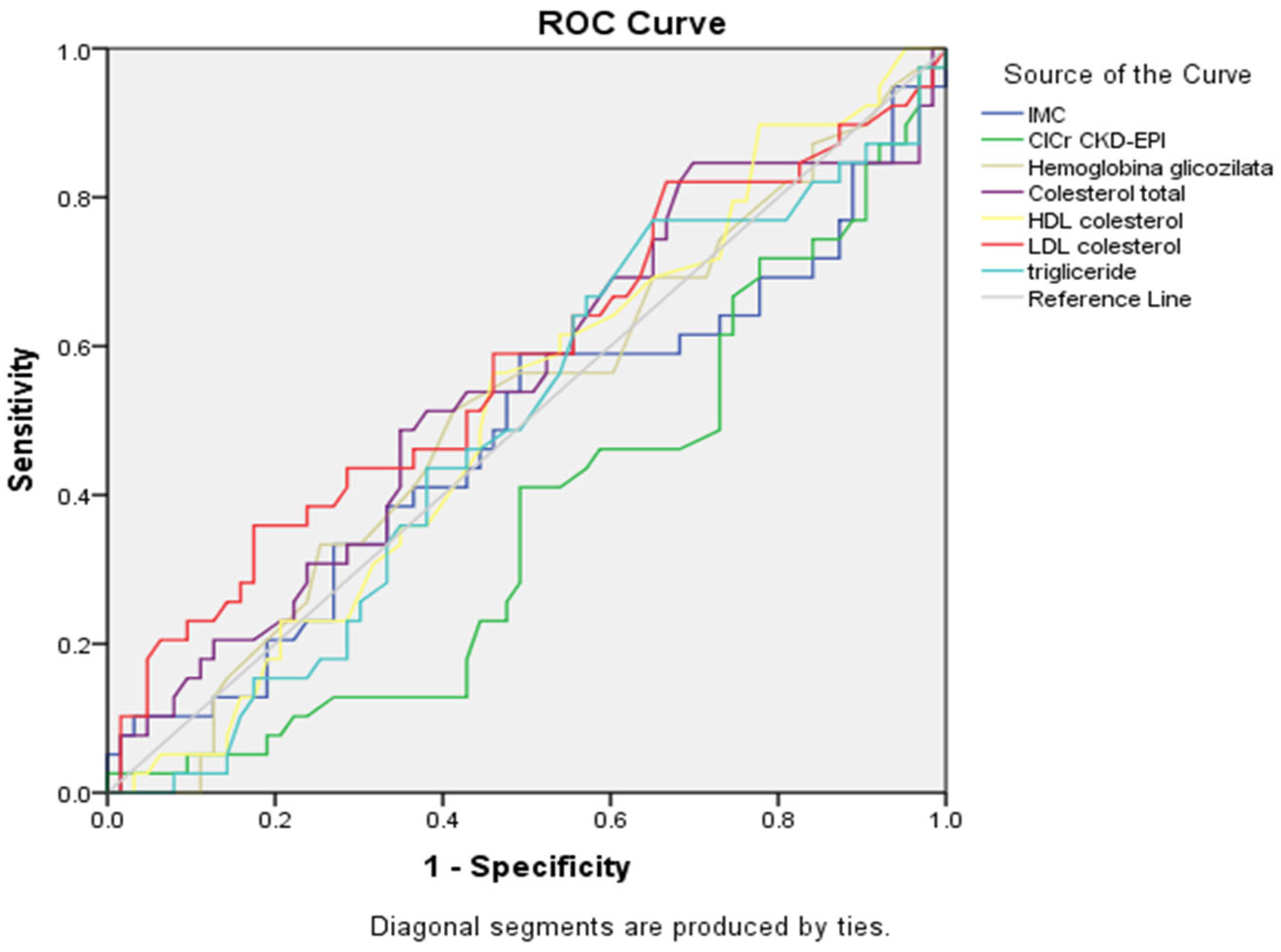 p = 0.216). The ROC curves confirmed these findings, with triglycerides and LDL cholesterol curves showing the greatest deviation from the reference diagonal line. Other metabolic parameters demonstrated poor discriminatory ability, with HbA1c and BMI curves and renal function, with their curves closely following the line of no discrimination.