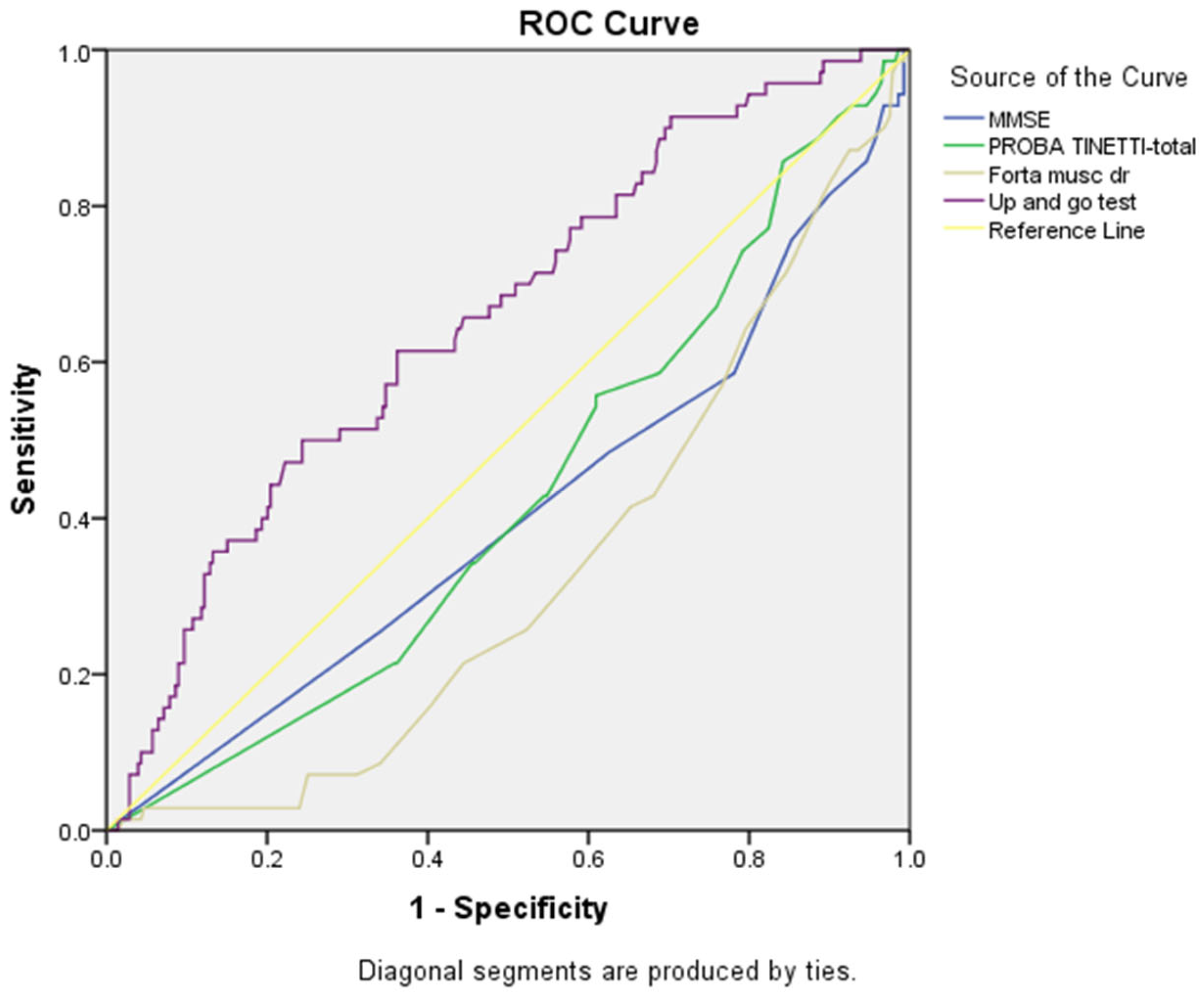 p = 0.014) while the Tinetti test demonstrated a trend toward inverse association (AUC = 0.428, 95% CI: 0.356–0.500,