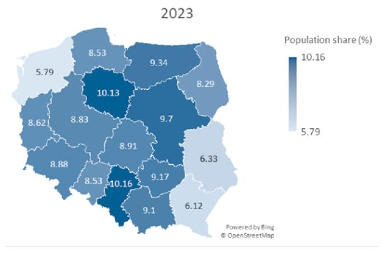 A map of Poland showing population share (%) of HPV vaccines among children aged 11–13 years for both sexes in particular voivodeships in year 2023.