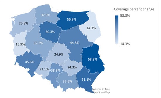 The data presented in Table 2 was used to calculate Spearman’s coefficients (and the corresponding t-test for these coefficients), as well as the Kruskal–Wallis test for the variable coverage change. The purpose of applying the Kruskal–Wallis test was to verify the hypothesis that the level of changes did not differ statistically across voivodeships.