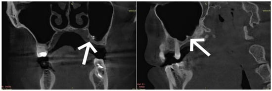 A CBCT scan revealed a radiopaque foreign body in the left maxillary sinus (arrow).