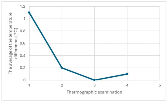 Differences in bilateral temperature (ΔT) were interpreted with reference to device accuracy, NETD, and expected physiologic symmetry under controlled conditions. The pre-operative ΔT of 1.1 °C substantially exceeded the typical bilateral variability observed in healthy individuals under standardized thermographic protocols [6]. Subsequent reductions (0.2 °C at two weeks and 0.0–0.1 °C at later follow-ups) were interpreted cautiously, acknowledging that values within ±0.1 °C approach the camera’s noise floor; for this reason, ΔT values after the second week were considered thermographically negligible.