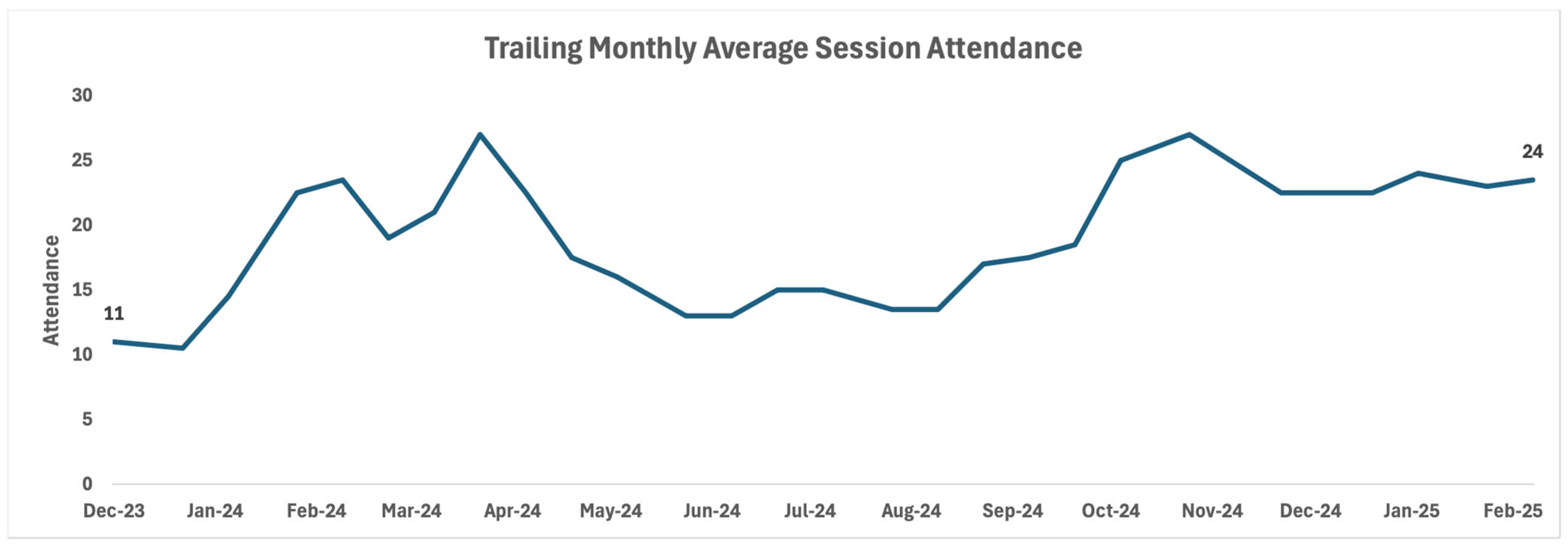 For each session, we calculated the total number of attendees and the average duration of attendance. We also examined the trailing average session attendance, which represents the rolling mean number of participants across successive sessions—an approach that smooths short-term fluctuations and more accurately illustrates trends in attendance over time.