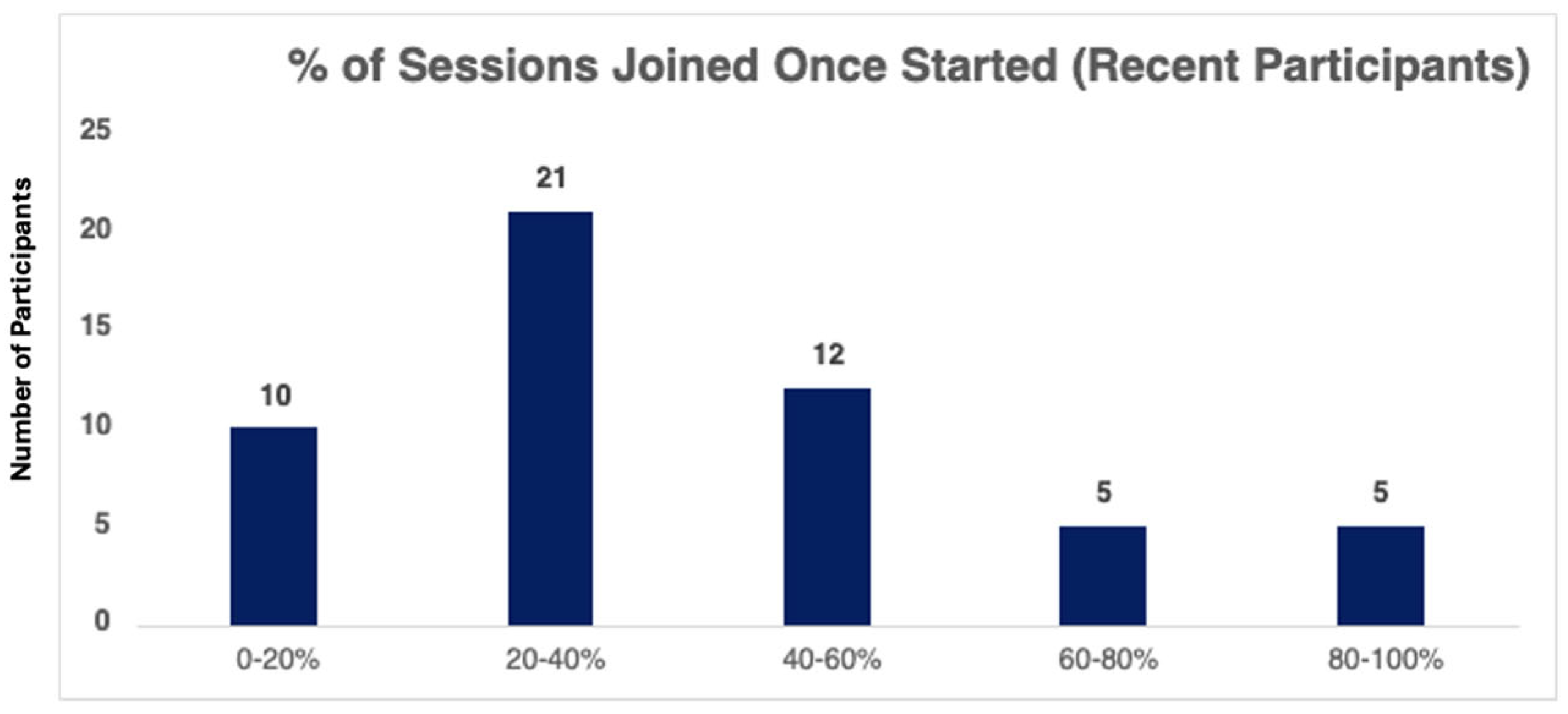 In addition, we calculated the percentage of sessions attended by each participant relative to the total number of sessions offered. This was used to estimate the average proportion of sessions joined after an individual’s first attendance, providing a measure of repeated participation and sustained engagement with the program.