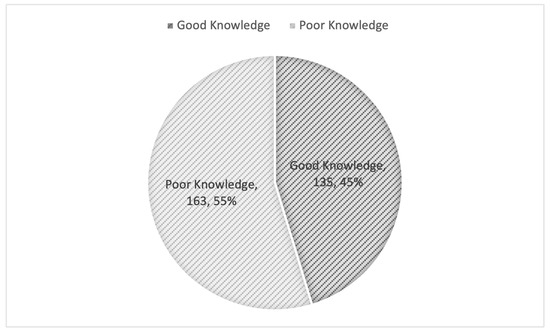 As shown in Table 2, the median knowledge score among the study participants was 5 (5–6). Overall, a total of 135 (45.3%) demonstrated good knowledge of biosimilar medicines, while 163 (54.7%) exhibited poor knowledge (Figure 1).