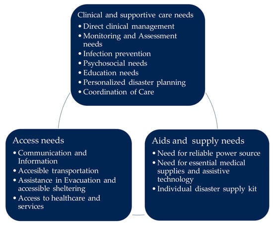Across the included studies, we identified three overarching clusters of care needs, the response to which is of existential importance for PwTD: “clinical and supportive care needs”, “aids and supply needs”, and “access needs”. Each cluster contained distinct needs, as illustrated in Figure 2. Within these clusters, we synthesized the needs described in each case and how these needs were specifically addressed during disasters based on empirical evidence.