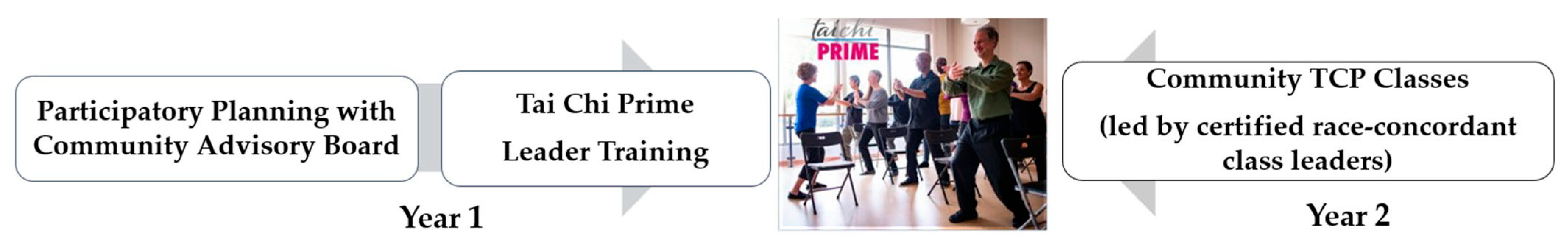 - Salihu, E.Y.; Hallisy, K.; Baidoo, S.; Malta, J.S.; Ferrill, C.; Melgoza, F.; Sandretto, R.; Culotti, P.C.; Chewning, B. Feasibility and Acceptability of a “Train the Leader” Model for Disseminating Tai Chi Prime with Fidelity in African American/Black and Latinx Communities: A Pilot Mixed-Methods Implementation Study. Healthcare 2025, 13, 2622. [Google Scholar] [CrossRef] [PubMed]