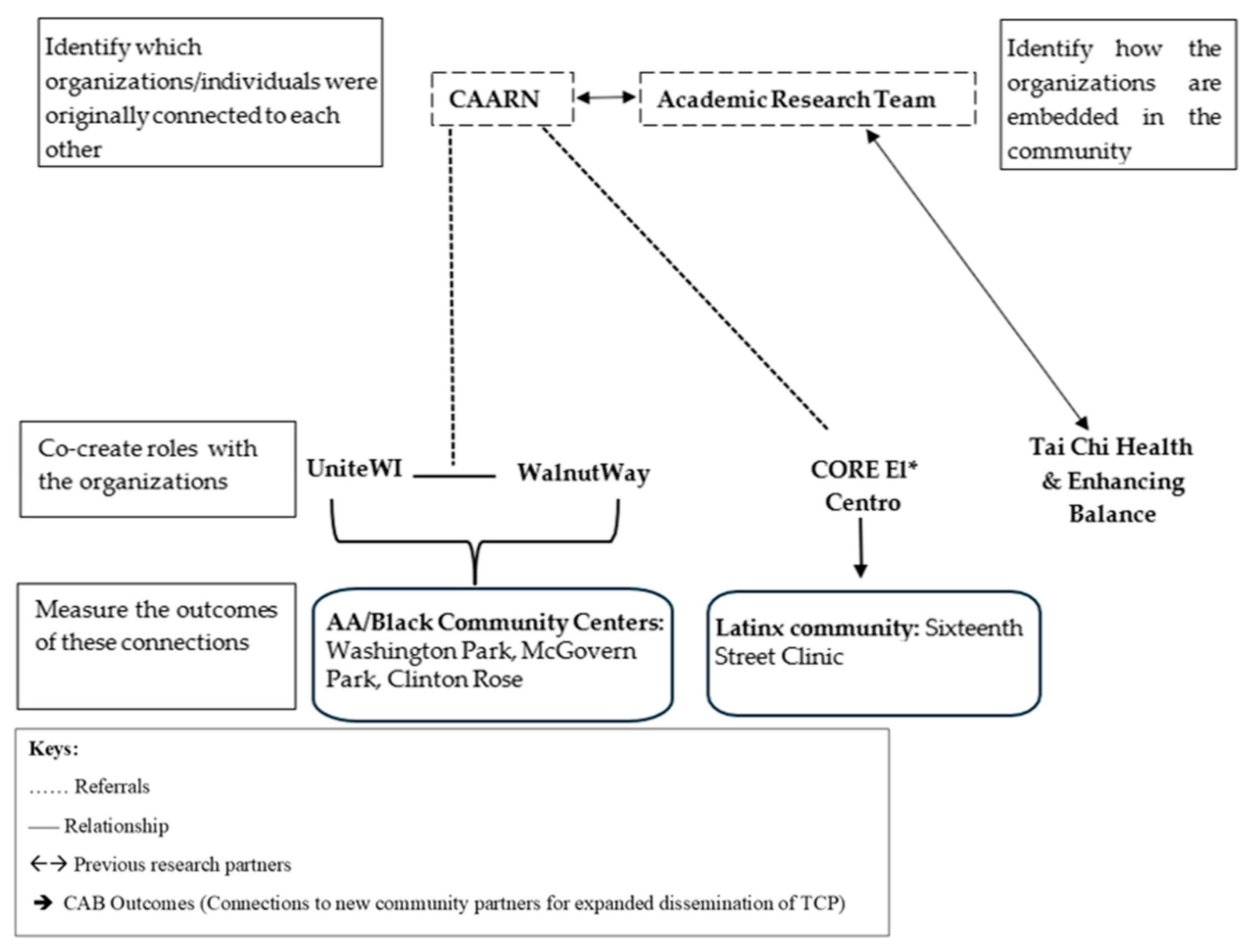 Salihu, E.Y.; Hallisy, K.; Malta, J.S.; Joseph, D.T.; Ferrill, C.; Culotti, P.C.; Juarez, R.H.; Chewning, B. A Community Advisory Board’s Role in Disseminating Tai Chi Prime in African American and Latinx Communities: A Pragmatic Application of the Consolidated Framework for Implementation Research. Healthcare 2025, 13, 3307. https://doi.org/10.3390/healthcare13243307