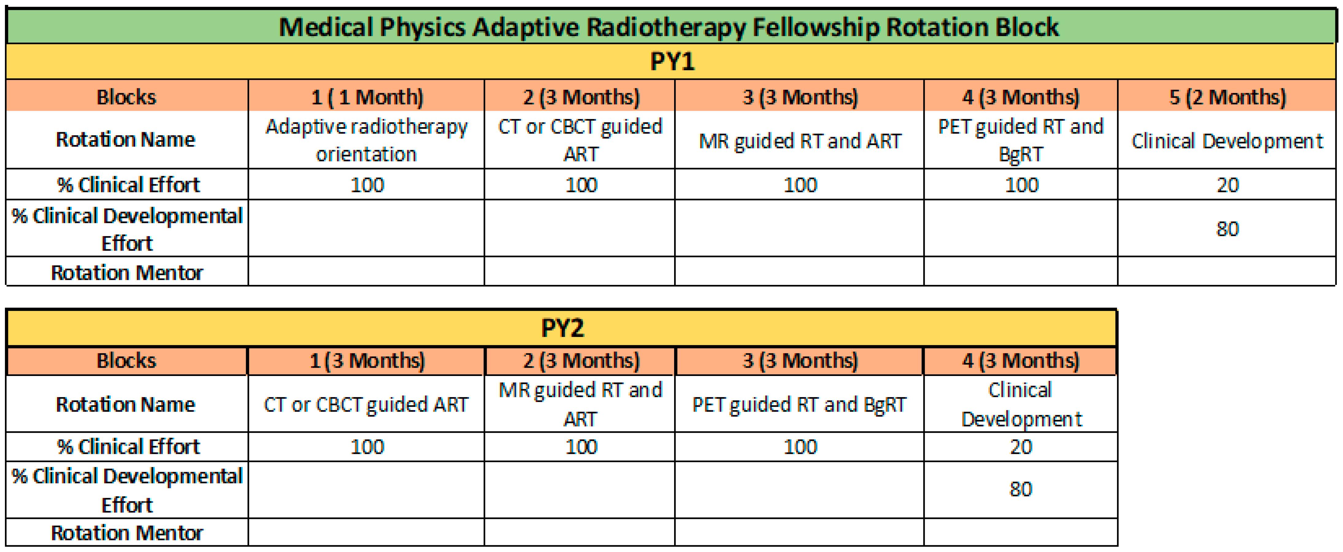 Recent ART training opportunities include vendor-provided initial and refresher programs that are typically platform-specific and delivered at vendor headquarters or on-site at client institutions. In addition, some centers offer short courses and workshops, often limited to several days or one week, and select residency programs may provide internal ART elective rotations that are not broadly accessible. These resources are valuable for disseminating knowledge and building familiarity with specific systems. The MPART Fellowship is designed to complement these models by providing a formal, multi-year, multi-modality training pathway with structured competency assessments across CBCT-, MR-, and PET-guided platforms. Unlike short, platform-specific courses, MPART integrates longitudinal, immersive clinical participation in planning, online adaptive coverage, and patient-specific QA, alongside opportunities for translational research. The program is intended to develop future ART leaders and to build upon—not replace—standard CAMPEP residency training. Fellows are also encouraged to disseminate their experience through abstracts and peer-reviewed publications.