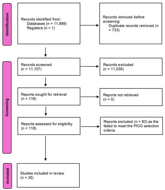 In total, 11,890 articles were identified, and following removal of duplicates, 11,157 studies were screened for eligibility. Title and abstract screening resulted in the identification of 118 articles which were suitable for full-text review. Subsequently 83 articles were excluded for not meeting the PICO selection criteria (Figure 1) and 35 studies were included, consisting of 6 randomised clinical trials, 1 controlled clinical trial, 1 quasi-experimental study, 23 prospective cohort studies, 2 cross-sectional studies, 1 longitudinal observational study and 1 qualitative study (Table 1). Nine studies met the inclusion criteria for meta-analysis, as illustrated in the PRISMA flow diagram (Figure 1).