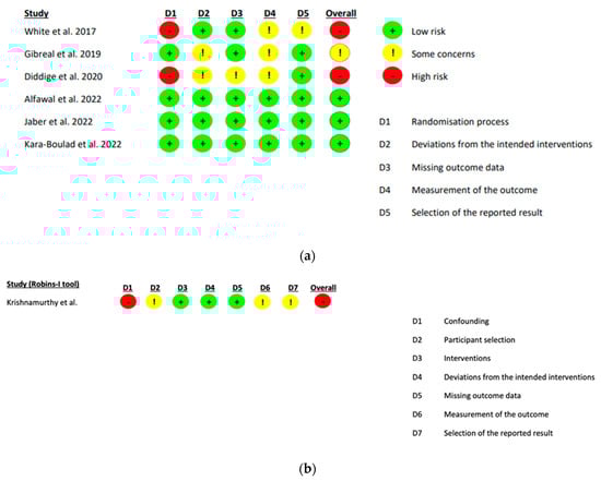 (a) Cochrane risk of bias 2 assessment of bias within randomised studies [11,19,20,21,22,23]. (b) ROBINS-I assessment tool for quasi-experimental studies [25].
