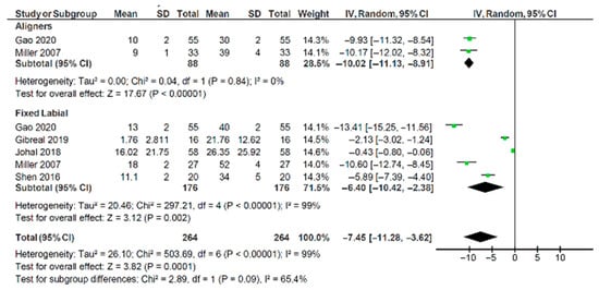 Figure 3 shows a forest plot with the combined VAS pain scores for studies that met the inclusion criteria. Aligners showed a significant reduction in pain scores between 24 h and 7 days after appliance fit, with an estimated reduction of −10.02 (95% CI: −11.13, −8.91). The two aligner studies were homogenous (I2 = 0%), adding significantly to the validity of the findings. The five labial appliance studies had high heterogeneity (I2 = 99%). The standardised mean difference in pain VAS scores between 24 h and 7 days was estimated −6.4 (95% CI: −10.42, −2.36) for labial appliances. The test for significant differences between them was not confirmed (χ2 = 2.89, p = 0.09). The heterogeneity for this comparison was moderate (I2 = 65.4%), suggesting a greater degree of caution in interpreting the findings from the studies evaluating labial appliances.